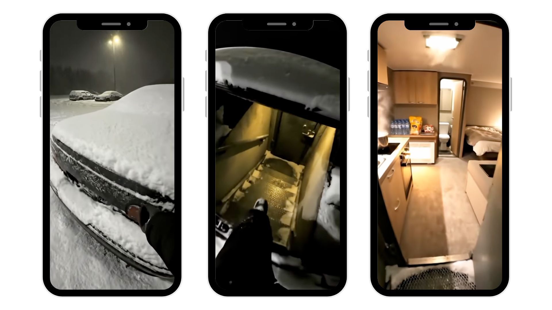 POV-style clips walking through snow, opening a car door, stepping into a warm cabin, and revealing a cozy interior. Viewers are asked to comment which version they like most.