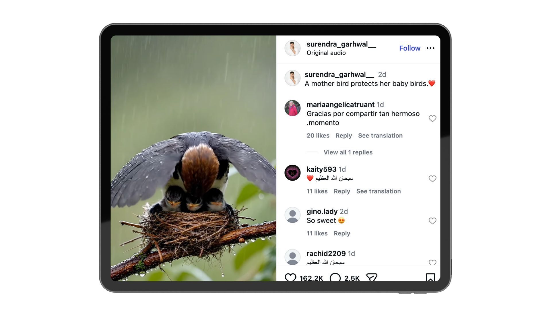 A mother bird shields her baby birds from the rain with her wings. No effects. Just a raw, emotional moment.