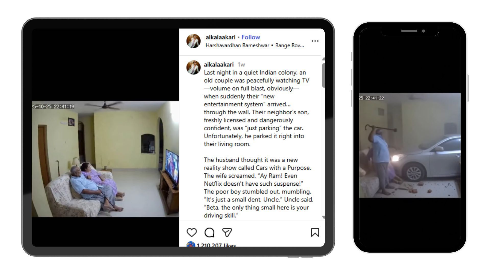 A home surveillance clip where a car crashes straight through a living room wall, captioned with a hilarious fake story and witty dialogue that feels like a sitcom.