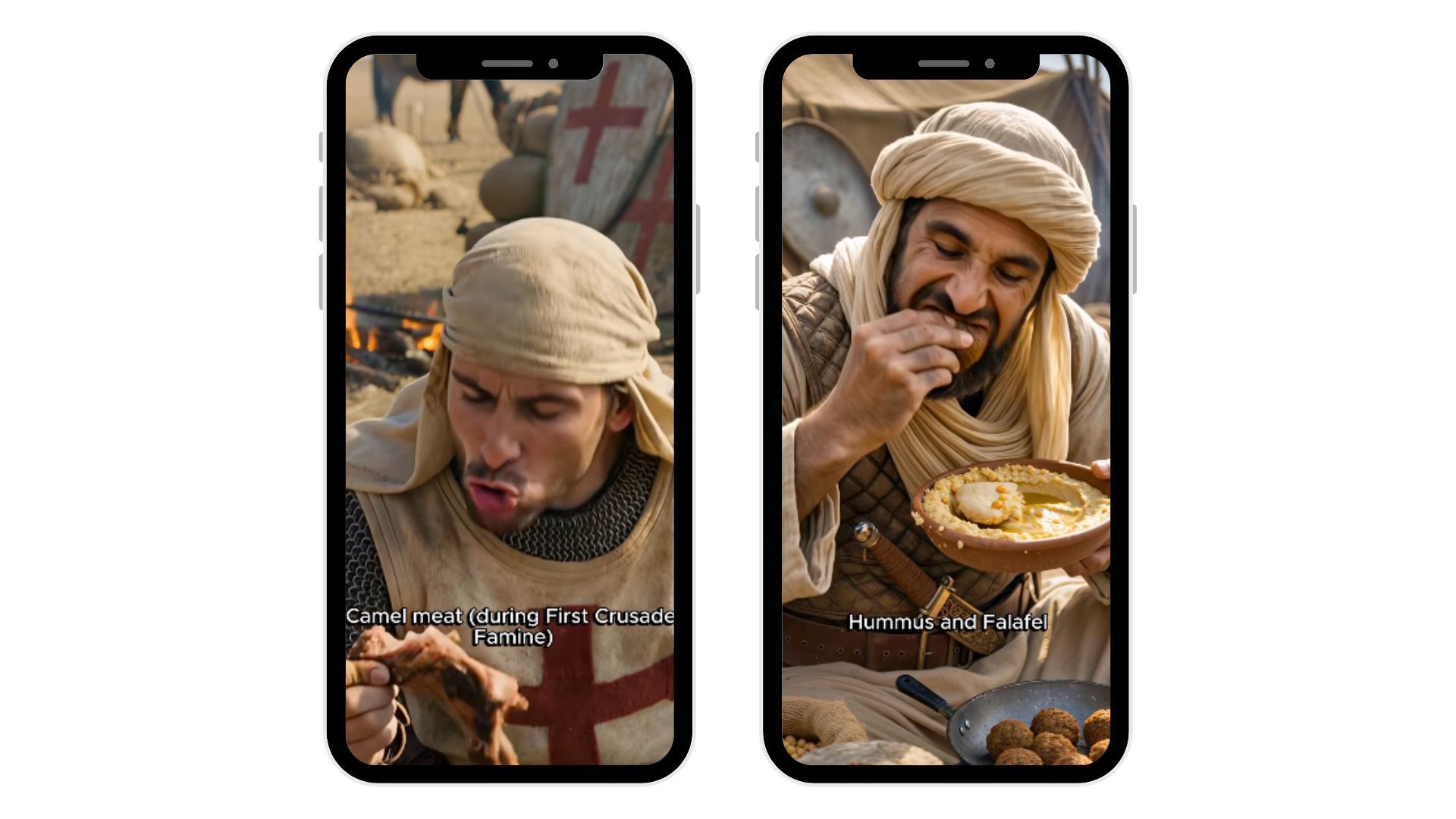 AI-generated medieval characters eating historically themed foods: chickpeas, camel meat, hardtack, dates, fermented yogurt. This is “edutainment” done right.