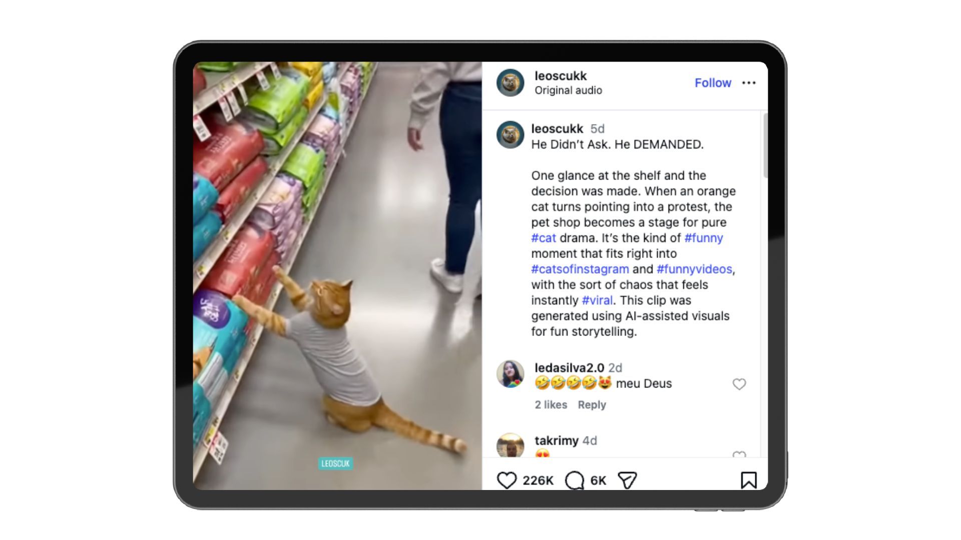 AI-assisted clip of a cat dramatically protesting in a pet aisle- grabbing, flopping, demanding attention. This is pure shareability.