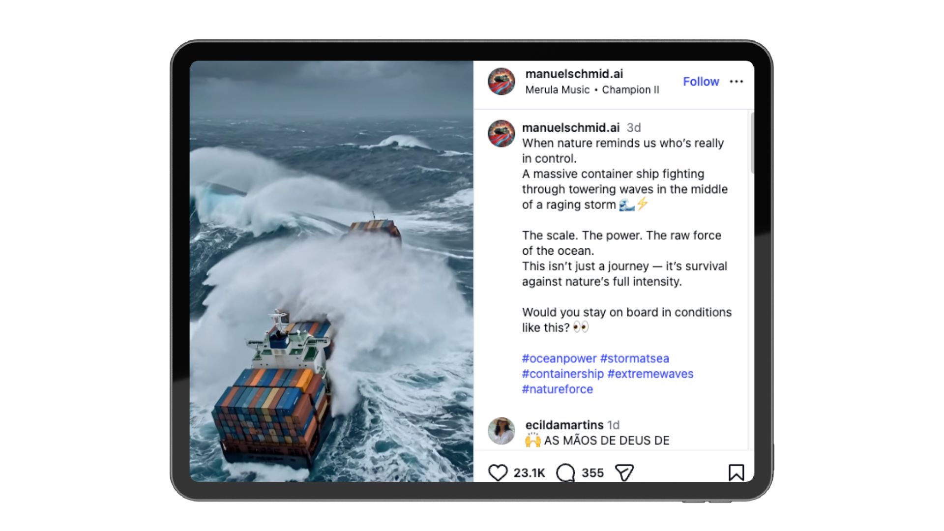 Hyper-realistic AI footage of a cargo ship battling towering ocean waves.