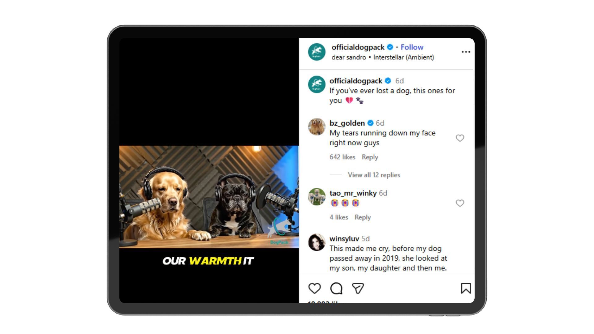 Two dogs “talk” into studio mics about death but from the dog’s point of view. They’re not afraid of dying. They’re worried you’ll be okay without them.
