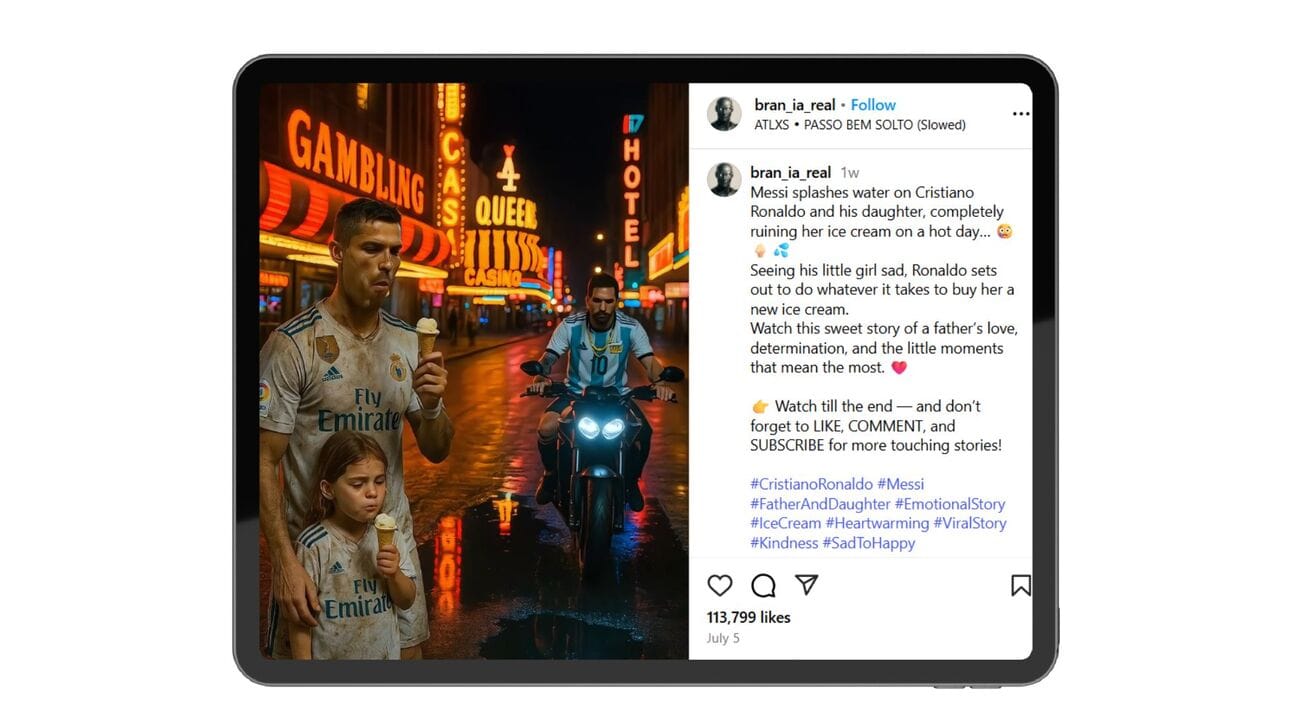 Cristiano Ronaldo comforts his daughter after Messi ruins her ice cream. It’s a fictional scene but told like a heartwarming sports drama.