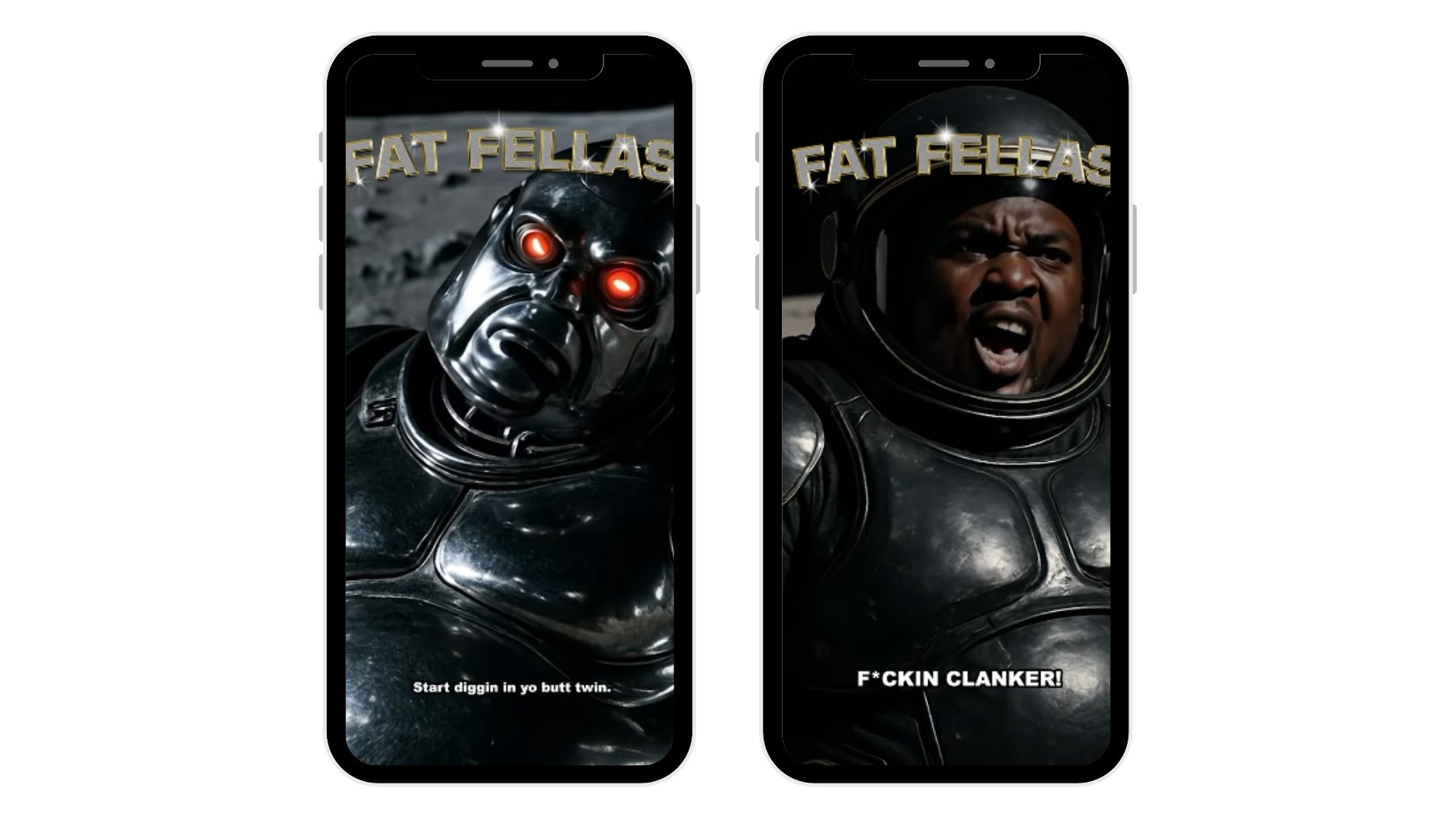 A gritty sci-fi parody called “FAT FELLAS” with chunky astronauts, glowing red eyes, and hilarious voiceovers. “It’s CLANKA not CLANKER!”