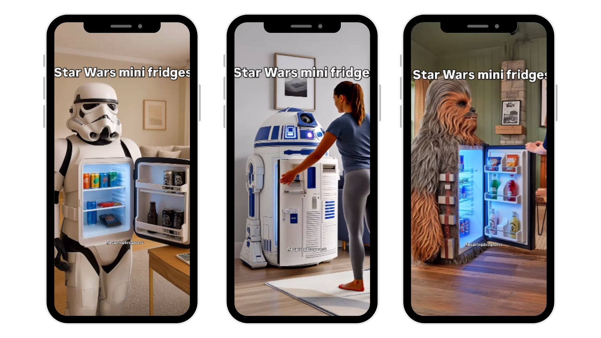 Ultra-realistic Star Wars character mini fridges (R2-D2, Stormtrooper, Chewbacca) opening in everyday home scenes.
