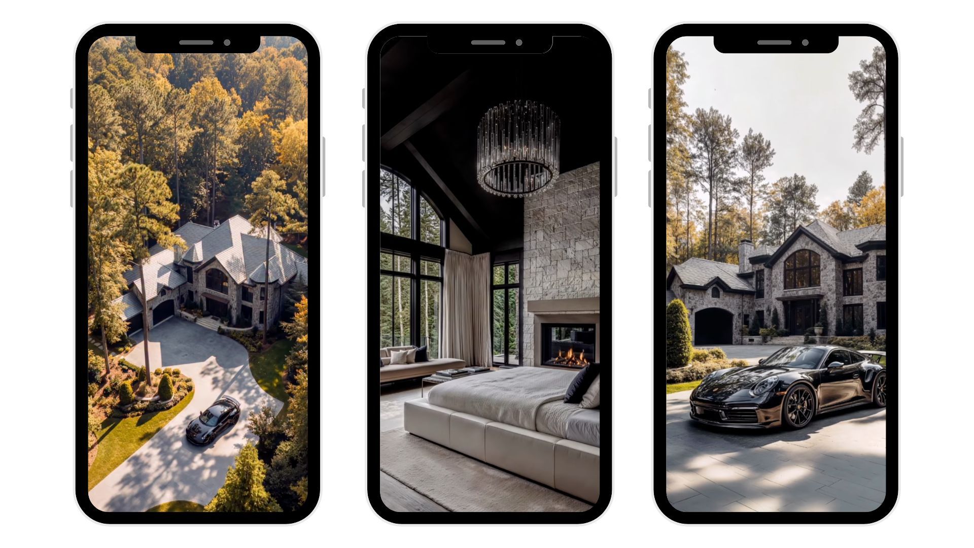 A cinematic tour of a luxury mansion surrounded by forest, paired with luxury cars and dramatic drone-style shots.