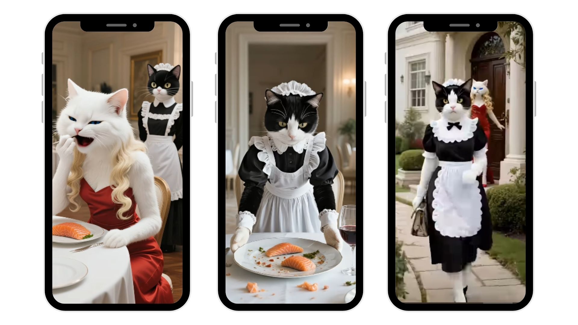 A white cat in a red dress dines luxuriously while a black cat maid serves her salmon and glares in silent judgment. The plot twist? The roles reverse, cue soap-opera-level betrayal energy.