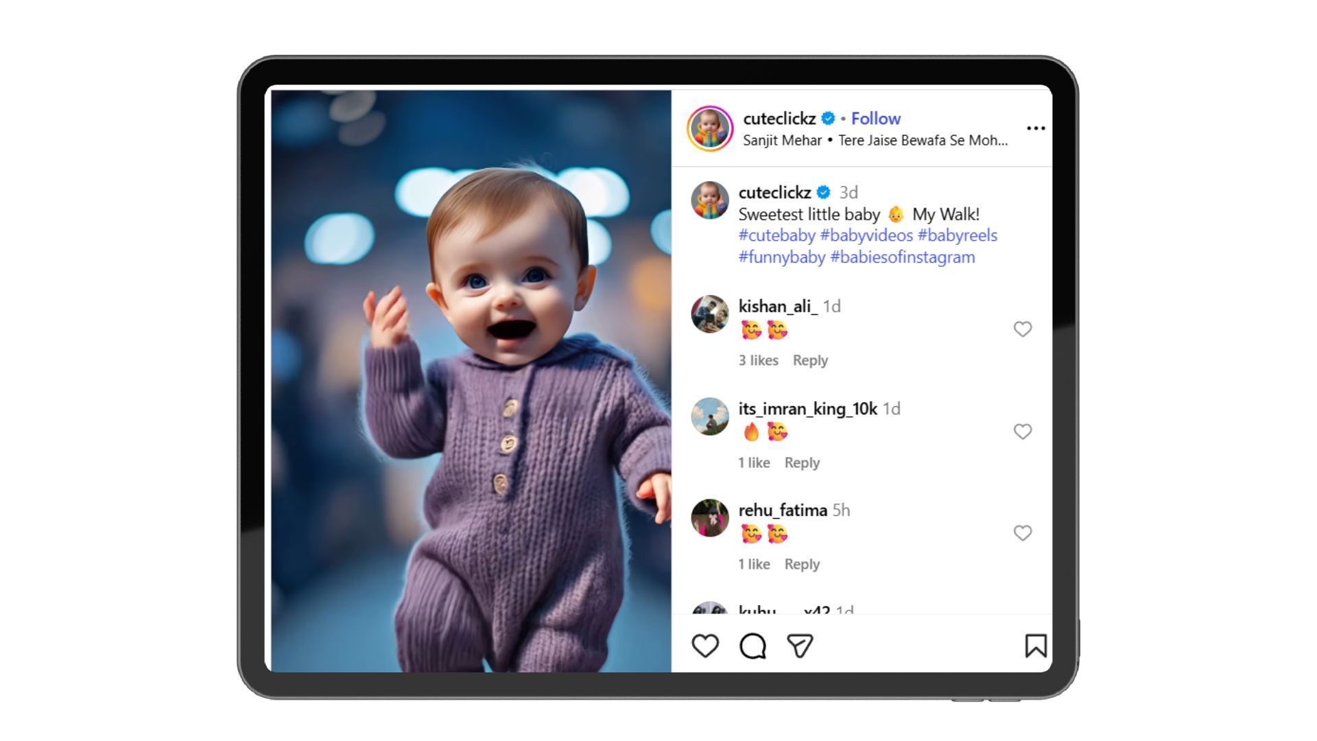 A super-realistic AI baby toddles toward the camera wearing a knitted jumpsuit and big brown eyes that could melt anyone. But the twist? It's paired with trending baby voiceover audio and the combo is absolutely irresistible.