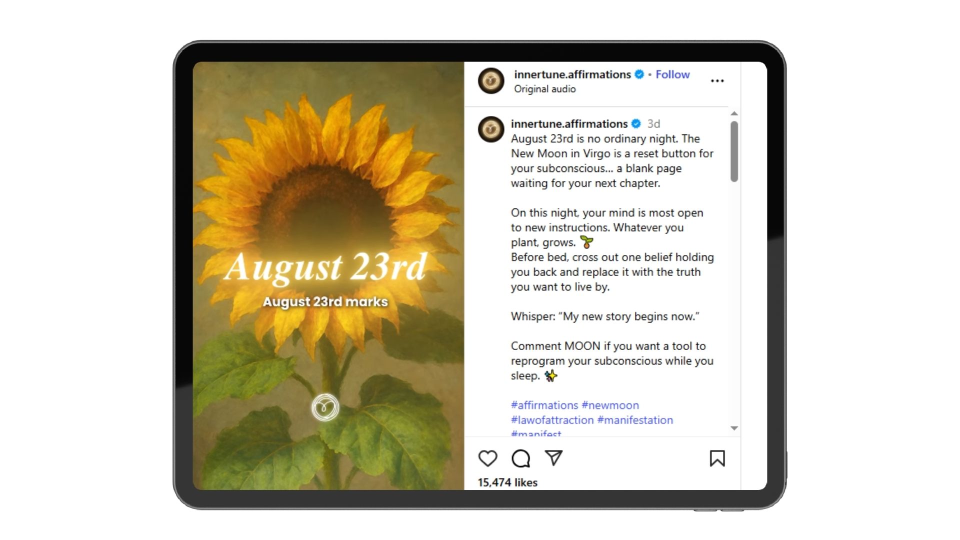 A creator uses the “New Moon in Virgo” as a hook, positioning it as a reset button for your subconscious. The post walks viewers through a simple ritual: crossing out one limiting belief before bed, replacing it with a new one, and whispering “My new story begins now.”